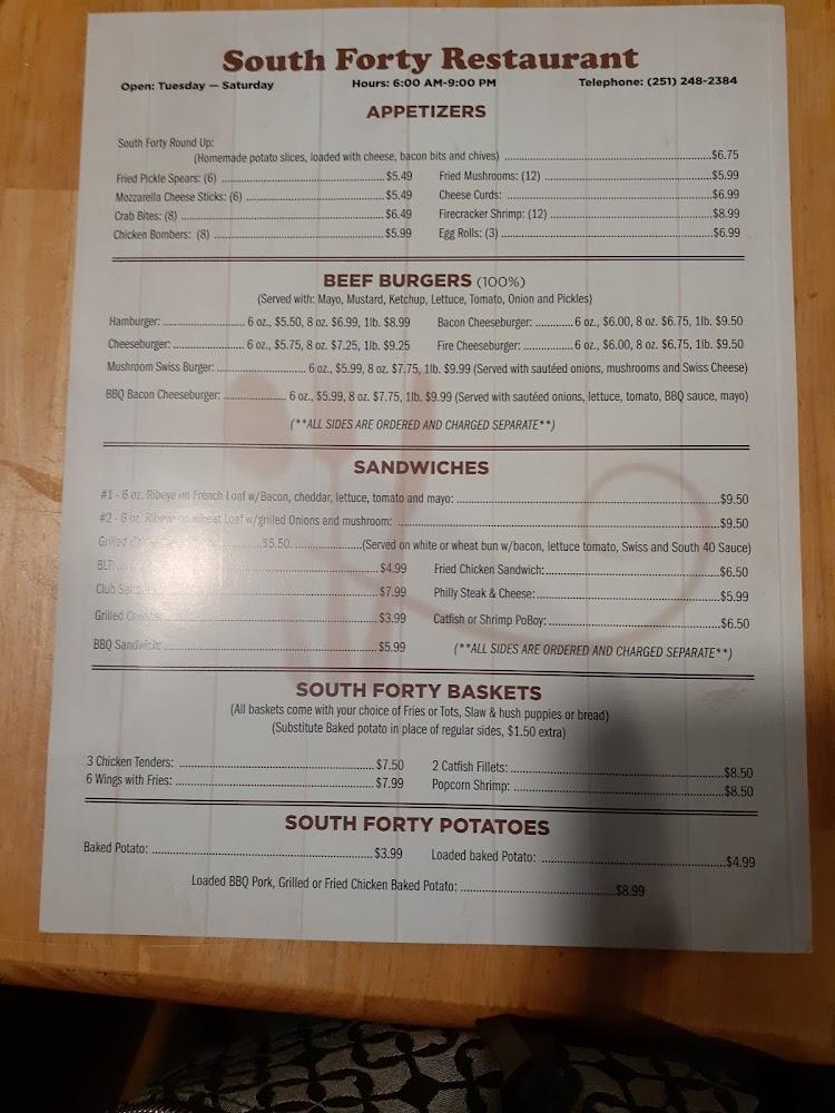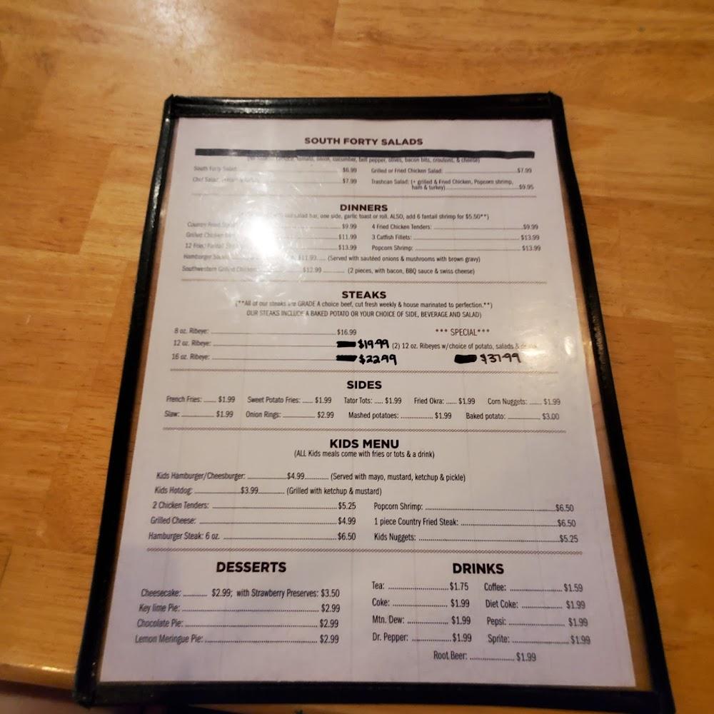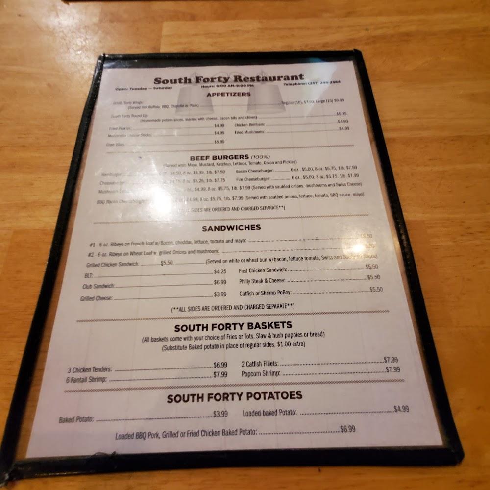 South Forty Restaurant offers a diverse menu featuring classic American cuisine. Customers can choose from tempting starters like fried mushrooms and mozzarella sticks. The burger selection is extensive, including favorites like the BBQ Bacon Cheeseburger and mushroom Swiss.