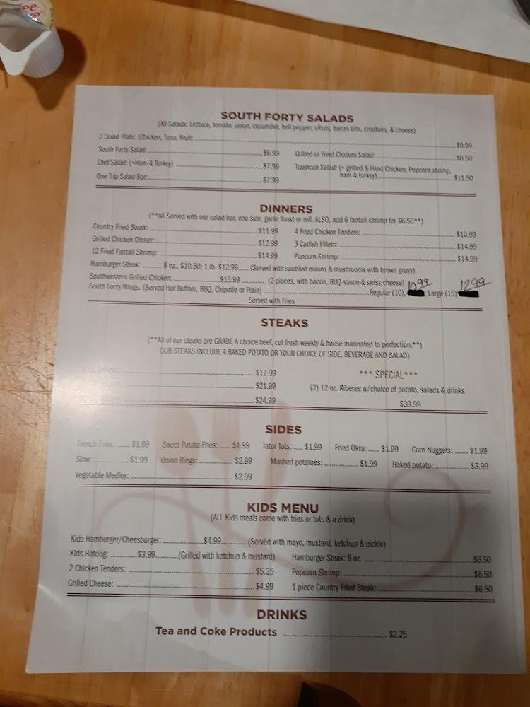 Discover the welcoming charm of South Forty Restaurant, located in Repton, Alabama. Enjoy a delicious menu featuring local specialties, perfect for breakfast, lunch, or dinner at affordable prices between $10-$20. Our café is known for its excellent desserts and a vast selection of teas, making it a popular spot for solo diners and groups alike. We offer convenient on-site services, takeout, and delivery, along with wheelchair accessibility for all guests. Experience a relaxed atmosphere in a cozy setting, ideal for enjoying healthy meals and small plates to share. Join us for a delightful culinary experience today!